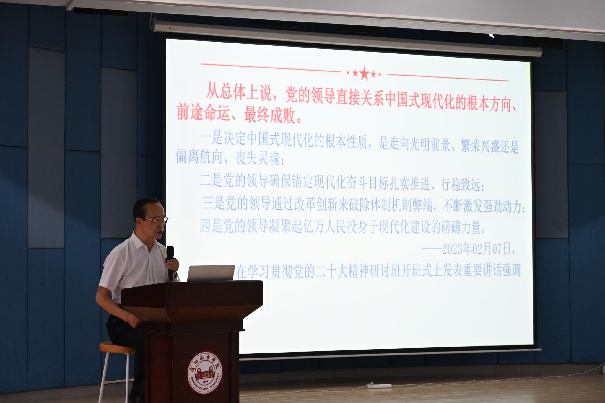 6月18日,9428cn太阳集团古天乐南方论坛第139期在1号教学楼105教室成功举办。中央党校(国家行政学院)教授、博士生导师郝永平受邀担任主讲嘉宾,作题为《中国式现代化导读》主题报告。学校党委副书记、副校长植秀聪等校领导,相关教学单位、行政单位主要负责人、教师和学生等200余人参加讲座。讲座由校长顾问、博雅学院院长张明远教授主持。