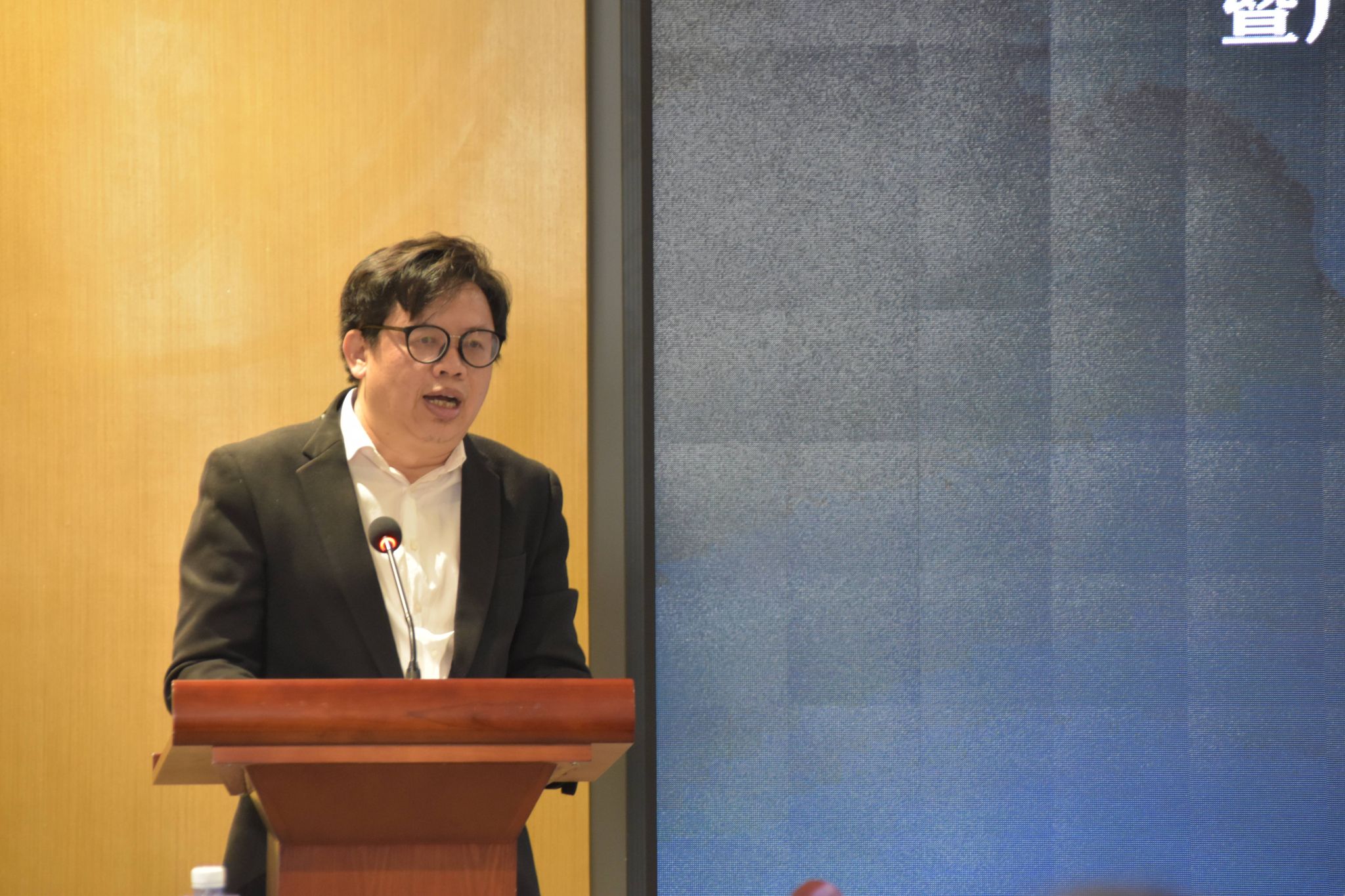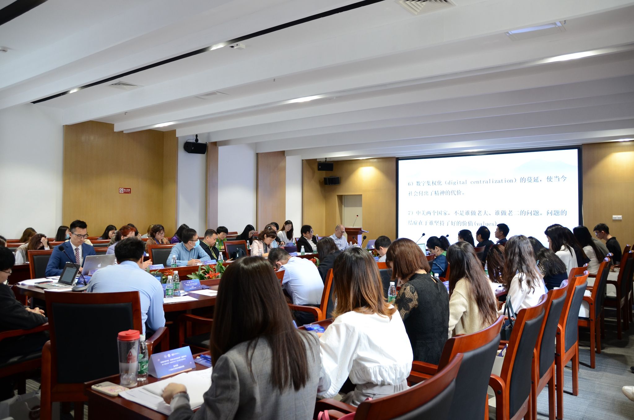 紧接着,由我校王伟老师为中山大学博士生导师、我校外国语学院院长丁建新教授主持,并表示对丁教授深刻的发言报告由衷憧憬。丁教授以《圣经·创世纪》为引,深入浅出地解释何为“深渊”。而面对疫情之下的中国和美国,数字时代的到来,生存还是毁灭?余外,他依凭“中美安克雷奇会谈”,强调在学术发展中要注重“民粹”精神。行云流水,潺潺自如,引得听者十分着迷,不舍其停歇。