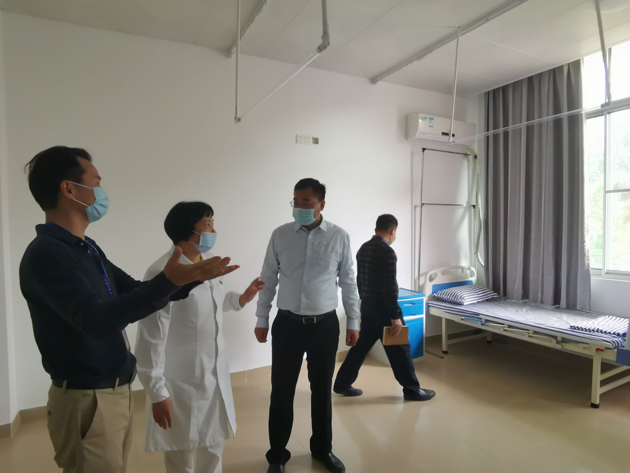 (督查组实地察看食堂、校医院预检分诊区、临时隔离留观室、集中隔离点及防疫物资储备室)
