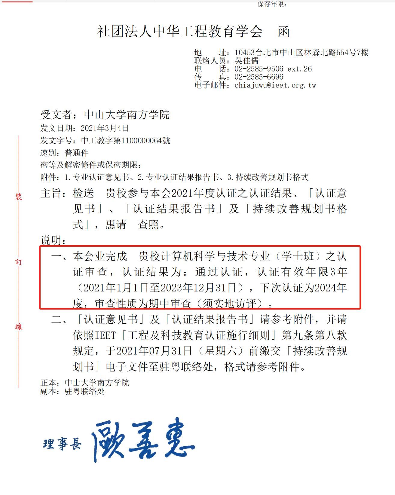 近日,中国台湾中华工程教育学会(Institute of Engineering Education Taiwan,简称IEET)公布了2021年度专业认证结果,我校电气与计算机工程学院(以下简称“电气学院”)计算机科学与技术专业顺利通过IEET资讯教育认证(Computing Accreditation Commission,简称CAC),首个认证有效期为3年。通过该认证,标志我校计算机科学与技术专业人才培养符合国际标准,该专业毕业生学历受国际认可。