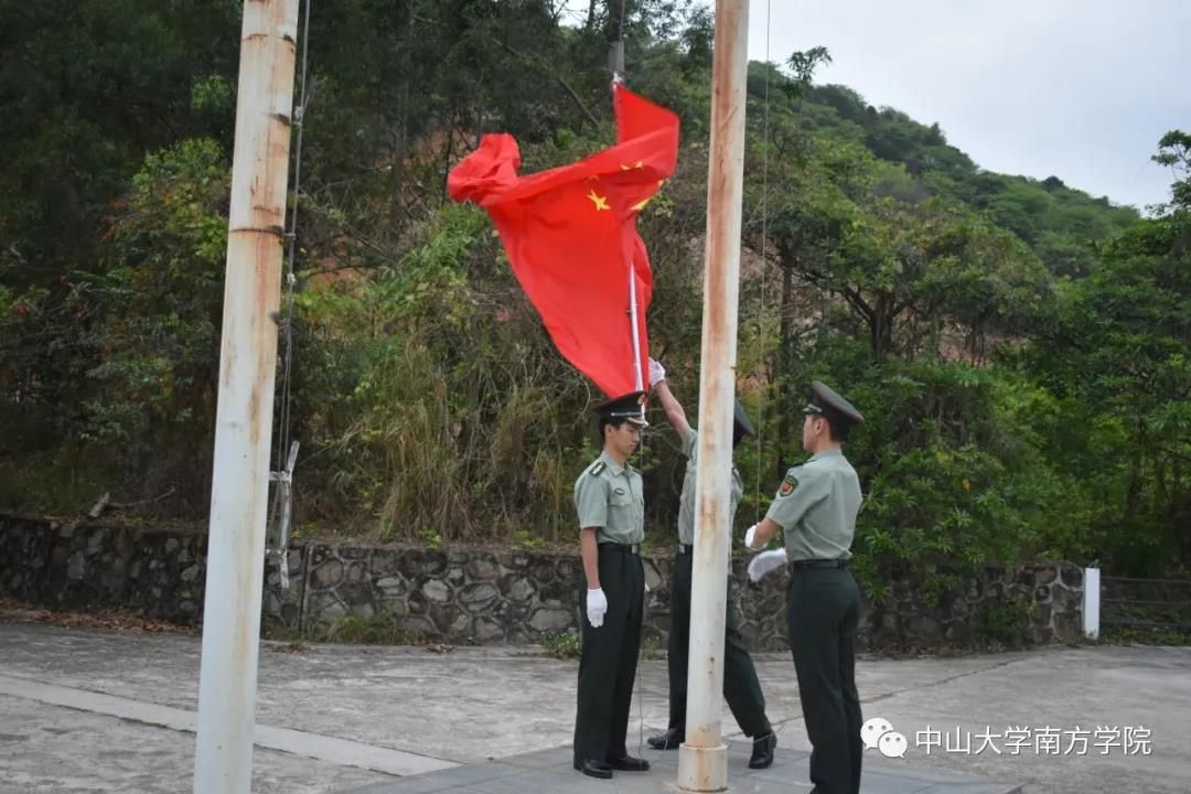学校大学生国防教育队踏着整齐的步伐护送五星红旗入场,升旗仪式开始,全体师生高唱国歌并向国旗行注目礼。