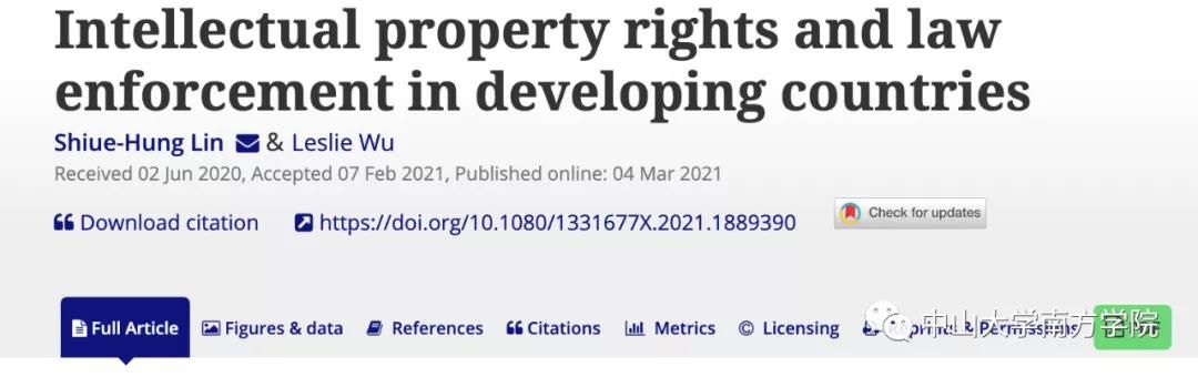 2021年3月4日,政商研究院2016级学生胡志翔作为第二作者提交的论文在国际期刊《Economic Research-Ekonomska Istrazivanja》发表,题为《Intellectual property rights and law enforcement in developing countries》,指导老师是林学宏副教授(第一作者)。