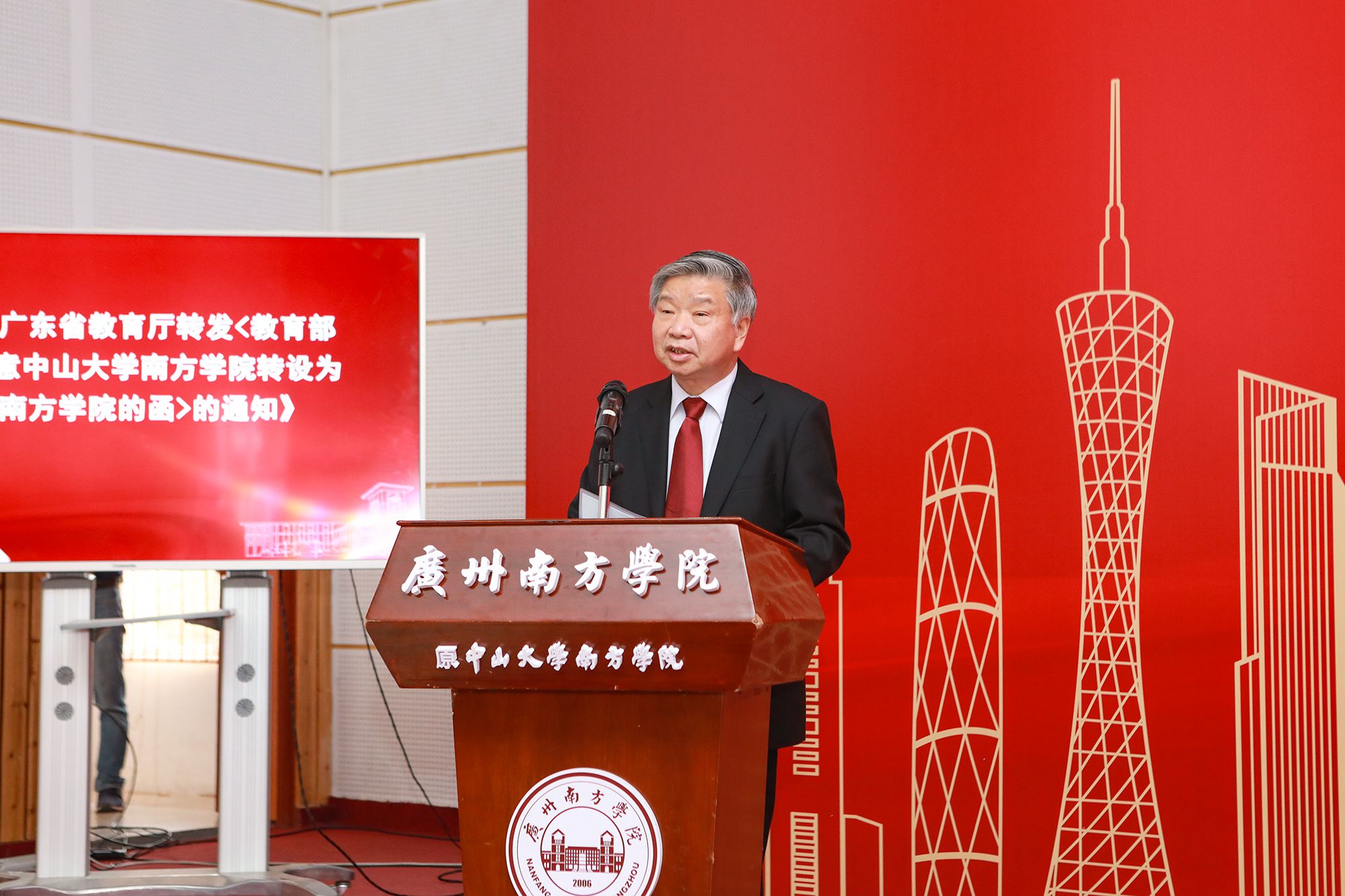 广州市从化区委常委、统战部部长孙柱致辞。他说,南方学院建校15年以来,在省教育厅的领导、中山大学支持、投资方的不断努力下,通过深化教育教学改革,加强师资队伍建设,积极搭建育人平台,不断推动政校协同育人,构建产教融合矩阵,取得丰硕的办学成果。培养的毕业生深受用人单位好评,社会认可度高,在社会上享受较高的声誉。学校立足于粤港澳大湾区,积极服务地方经济,参与推动从化区经济转型升级,为从化区经济发展贡献了卓有成效的力量。对此,从化区委、区政府对学校表示衷心感谢。