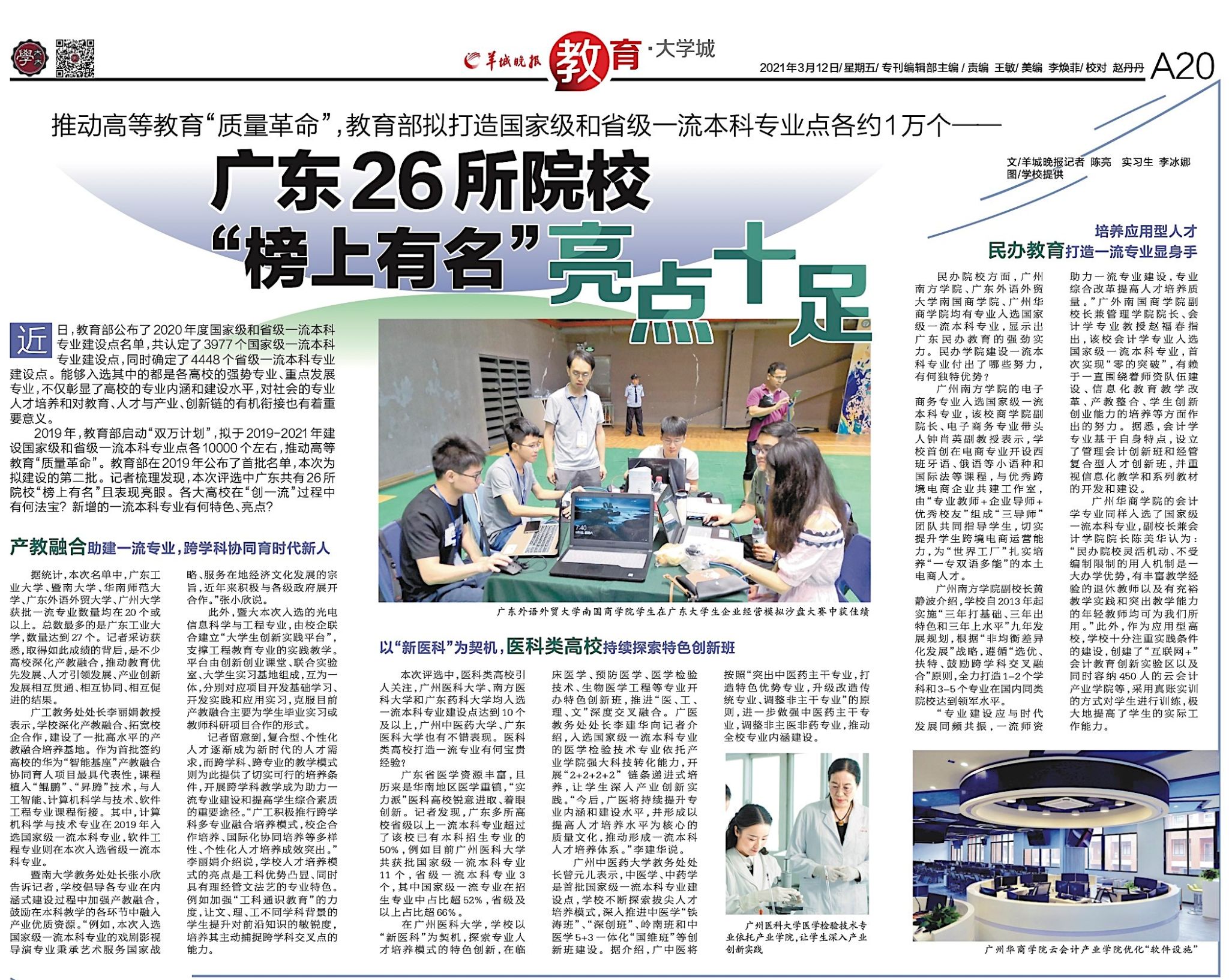 3月12日,《羊城晚报》刊发长篇报道,介绍广东省高等院校入选国家级和省级一流本科专业建设点情况,我校副校长黄静波教授、商学院副院长、电子商务专业带头人钟肖英副教授接受了记者采访,介绍我校连续两年入选国家级一流本科专业建设点名单,入选数量在全省同类院校排名第一的情况。