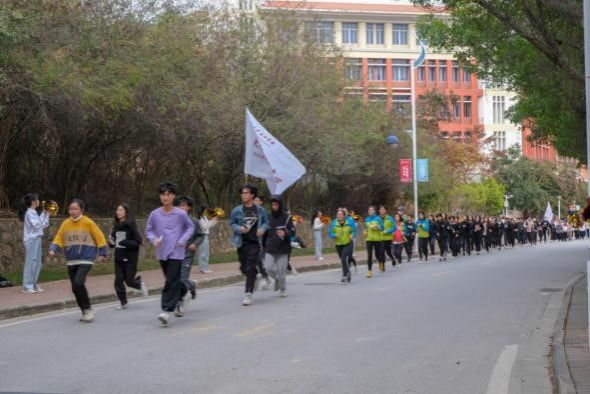 随后,体育教学中心史悦红老师带领校领导和师生们跳健身操热身,随着喻世友校长鸣笛,学校领导一同出发,带领广大师生开启环校长跑。各院系、部门工会队伍以整齐有序的步伐、士气高昂地行进在校道上,不时传来铿锵有力的口号声,响彻校园,展现了师生员工的飒爽英姿,彰显了南方人活力向前、砥砺奋进的精神风貌。校团委在沿途组织啦啦操等快闪活动,为长跑的师生员工加油助威。
