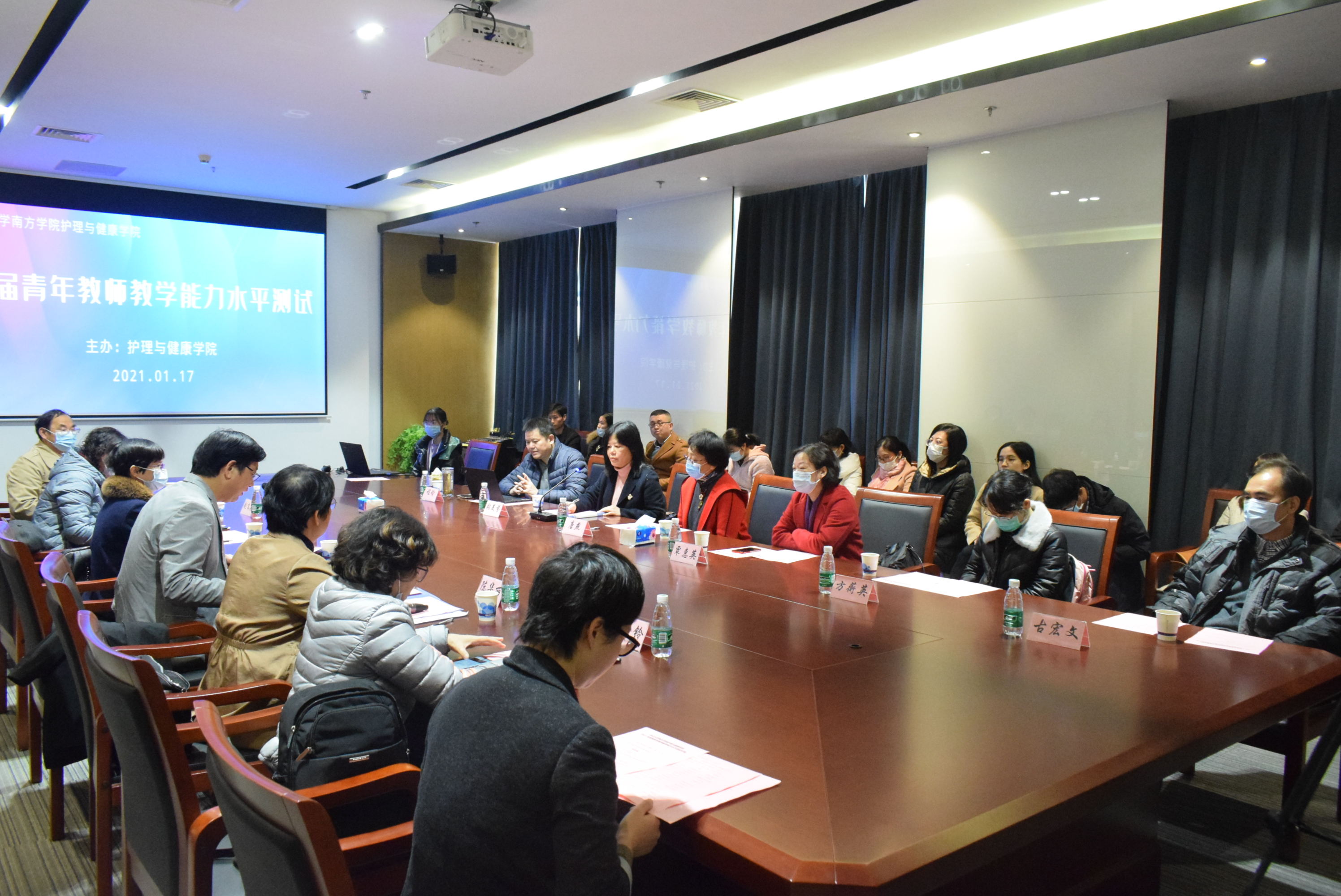 中山大学社会学与人类学学院程瑜教授,中山大学附属肿瘤医院护理部主任覃惠英主任护师,中山大学附属第三医院护理部方蘅英主任护师,中山大学南方学院云康医学与健康学院赵爱明教授,中山大学南方学院护理与健康学院院长、博士生导师张美芬教授,护理与健康学院名誉院长方海云主任护师,护理与健康学院常务副院长陈华丽副主任护师,护理与健康学院古宏文副教授、谭坚铃副教授、赵飞英副教授组成测试评议组。中山大学南方学院校长喻世友,常务副校长、党委副书记唐燕,副校长黄南松出席会议并讲话,学院全体青年教师参与了本次测评。本次会议由中山大学南方学院护理与健康学院常务副院长陈华丽主持。