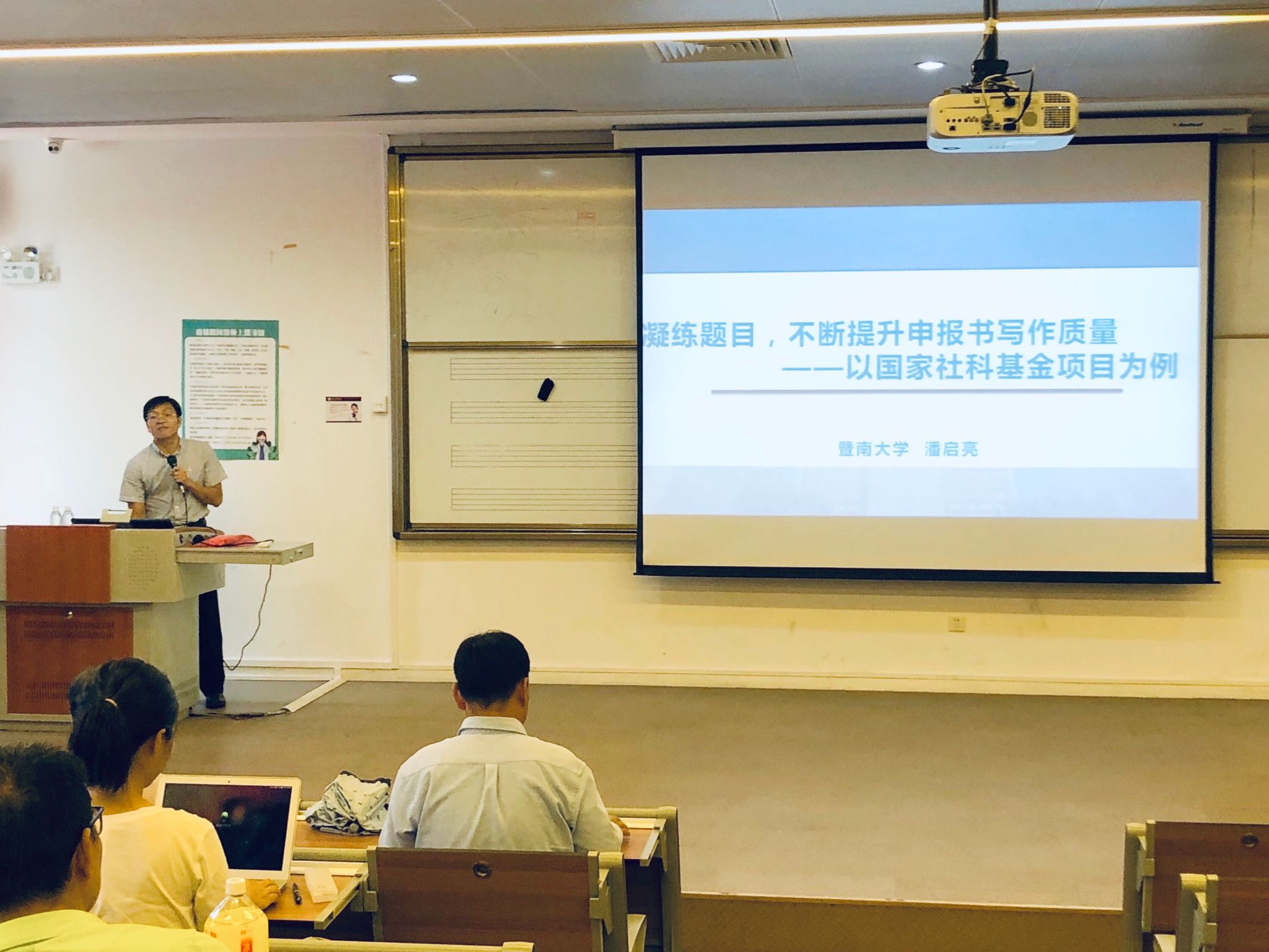 讲座上,科研部严严五胤部长首先对潘启亮处长的到来表示热烈的欢迎,并对我校的科研情况作简单的介绍。接下来,潘启亮处长首先介绍了国家社科基金项目的类型及立项情况。随后,针对国家社科基金项目申报书的项目选题,潘启亮处长从思想正确、顶天立地、兼顾特长、注重创新、难度适中等方面重点阐述了项目选题的整体要求,同时结合自己多年的实践经验,提出了具体的选题建议。紧接着,潘启亮处长以大量暨南大学申请书为例,从选题依据、研究内容、思路方法、创新之处、预期成果等方面详细分析了课题的设计论证,并指出申报书写作的注意事项。