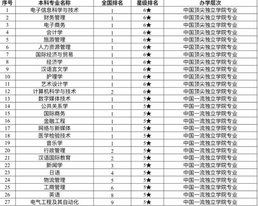 日前,艾瑞深中国校友会网最新发布《2020中国大学评价研究报告—高考志愿填报指南(校友会版)》,我校12个专业荣膺中国六星级专业,跻身2020中国顶尖独立学院专业行列,15个专业荣膺中国五星级专业,跻身中国一流独立学院专业行列,涵盖我校管理学、经济学、文学、工学、医学、艺术学全部6个学科。在2020中国独立学院一流专业排名中,我校位列全国第四。