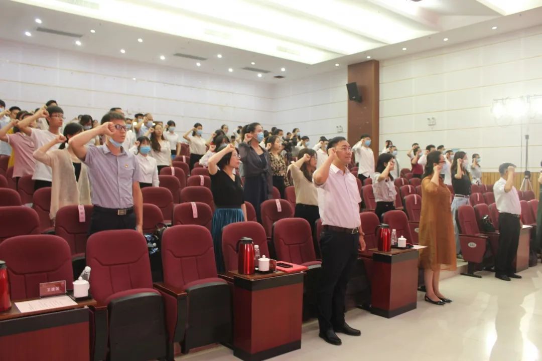 颁奖结束后,党旗入场,全体党员起立,面对党旗,举起右手握拳,由会计学院党总支书记卫建国同志作为领誓人,带领全场新党员进行入党宣誓、老党员重温入党誓词:“我志愿加入中国共产党,拥护党的纲领,遵守党的章程,履行党员义务,执行党的决定,严守党的纪律,保守党的秘密,对党忠诚,积极工作,为共产主义奋斗终身,随时准备为党和人民牺牲一切,永不叛党。”八十字入党誓词字字千钧、句句铿锵,激励全场党员牢记入党初心,勇担时代使命,用行动为祖国发展、为民族复兴事业添砖加瓦。