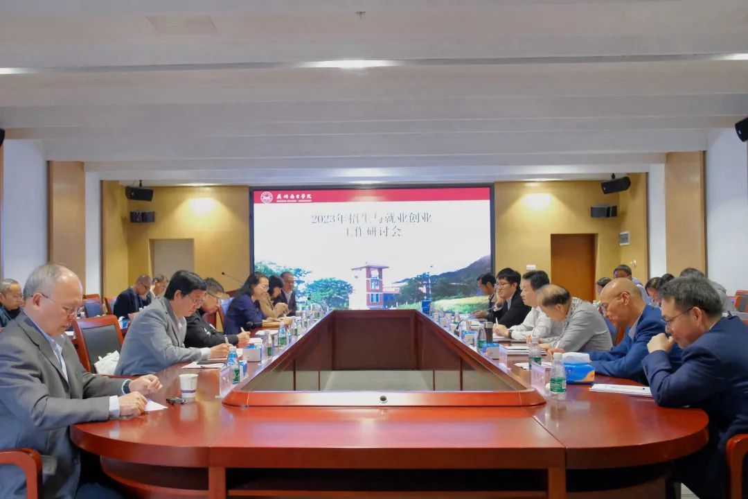 12月13日,我校2023年招生与就业创业研讨会在新综合楼第一会议室召开。广东省教育考试院党委书记、院长欧阳谦,广东省民办教育协会常务副会长张耀荣,智联招聘就业研究院大数据专家权瑞应邀出席研讨会并作专题报告。学校校长喻世友、党委书记李建超、副校长龚鸣、副校长黄南松、副校长兼财务总监王兰、副校长夏亮辉、校长助理蒋玮及各院系、各职能单位负责人和招生就业工作队伍教师代表参加会议。研讨会由党委副书记、副校长植秀聪主持。