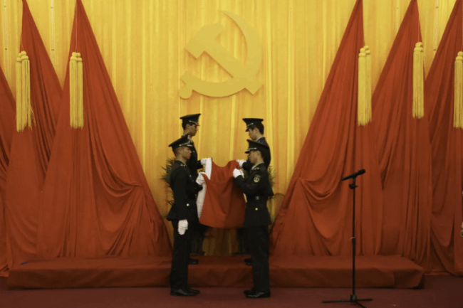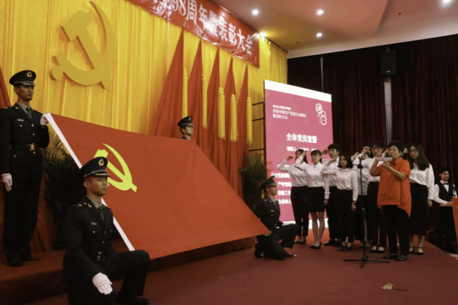 颁奖结束后,在庄严的氛围中,党旗入场,全体党员起立,面对党旗,举起右手握拳。由马克思主义学院院长王丽荣同志领读誓词,新党员进行庄严地入党宣誓,党员同志们集体重温入党誓词:“我志愿加入中国共产党,拥护党的纲领,遵守党的章程,履行党员义务,执行党的决定,严守党的纪律,保守党的秘密,对党忠诚,积极工作,为共产主义奋斗终身,随时准备为党和人民牺牲一切,永不叛党。”铮铮誓言,许下庄严承诺,激励广大党员牢记入党初心,勇担时代使命,在新时代砥砺前行、不懈奋斗、建功立业。