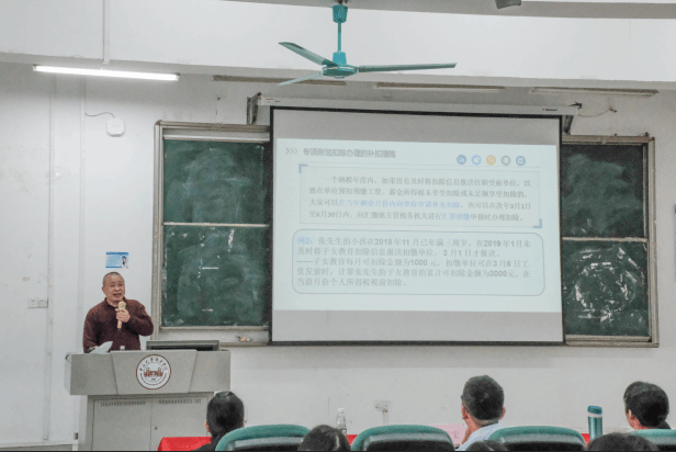 紧接着谢所长重点讲解六项专项附加扣除。六项专项附加扣除包括子女教育、继续教育、大病医疗、赡养老人、住房贷款利息以及住房租金,谢所长耐心的为大家讲解专项附加扣除政策的条件和标准。除此之外,谢所长也提及了相关的专项附加扣除的起止时间、办理途径、办理的补扣措施以及操作方法等事宜以及注意事项。