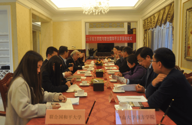 1月4日下午,我校与联合国和平大学合作备忘录签约仪式在专家楼举行。联合国和平大学校长弗朗西斯科·罗哈斯·阿拉贝纳,联合国和平大学校董、中国国际跨国公司促进会常务副会长张笑宇,广东珠江投资控股集团有限公司执行董事、副总裁、中山大学南方学院董事长丁文先生,中山大学南方学院校长喻世友出席签约仪式。
