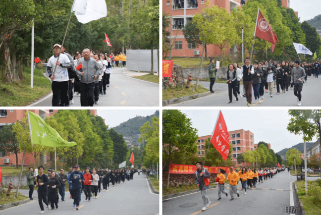 全场奏唱国歌和校歌后,喻世友校长鸣响发令枪,环校跑活动正式开始。各单位方阵依次出发,环绕学校跑步前进。长跑队伍途经东区饭堂、孙中山先生铜像、西区饭堂、图书馆等地,最后回到新综合楼前。在长跑途中,在旗手的带领下,各方队整齐有序地向前奔跑,师生们步伐矫健,时而喊着口号,时而相互鼓励,大家活力满满,热情洋溢,展现了南院人积极向上、团结拼搏的精神面貌。沿途更有工作人员手举指示牌,为参与师生指引方向。