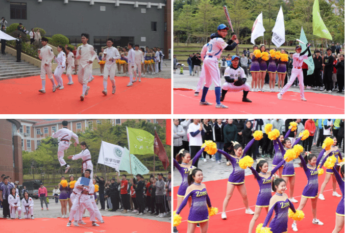 尽管气温较低,但师生们参与的热情高涨。下午两点半,入场仪式正式开始,伴随着音乐和主持人的解说,各单位方队迈着整齐的步伐,喊着响亮的的口号,依次入场。各单位方队入场完毕后,击剑队、棒球队、跆拳道队、啦啦队还带来了精彩的现场表演,赢得了一阵阵热烈的掌声。