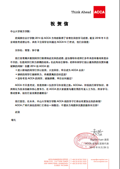 近日,会计学院收到2封来自ACCA广州代表处的祝贺信,其对会计学院ACCA方向班学子取得的优异成绩进行了祝贺,更高度肯定了会计学院ACCA方向班的办学成果。