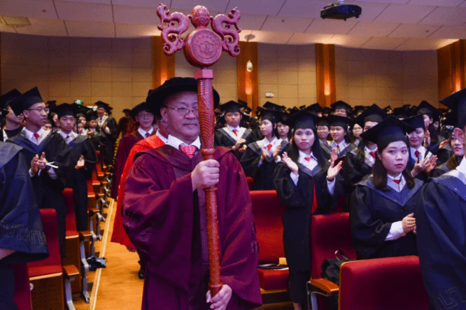 在庄严隆重的氛围中,执权杖教授何兴强恭请校长喻世友教授颁授学位。主持人宣读学位授予名单,而台下老师细心为每位即将登台的同学整理衣冠、拨正流苏。现场毕业生们依次登台,从喻世友校长手中接过学士学位证并致谢。主礼教授喻世友微笑着给每一名毕业生送上学位证书、一一与他们亲切握手。与校长庄重握手、学位帽上的流苏从右拨到左后,各位毕业生们的本科求学之旅也将画上圆满的句号。