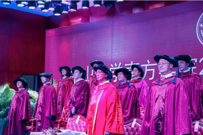 随着雄壮的国歌奏唱完毕,全体毕业生起立聆听孙中山先生的毕业训词,“学海汪洋,毓人作圣。大学毕业,此其发轫。植基既固,建业立名。登峰造极,有志者成。为社会福,为邦家光。朂哉诸君,努力自强。”训词字字铿锵、掷地有声,这48个字,蕴含着孙中山先生对每位毕业生的谆谆教诲和殷殷嘱托。