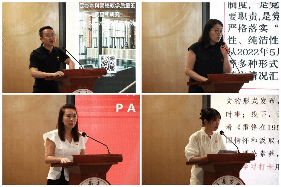 会议第一阶段,学校48个基层党支部书记依次对2023年春季学期“三会一课”制度落实情况进行专题汇报。各党支部书记聚焦主题教育有关要求,围绕“三会一课”制度落实、特色活动开展、党建带团建情况、建章立制情况等检查重点进行现场汇报,多角度、全方位展现了各支部开展主题教育的典型经验和特色亮点。会议通过“登台亮相”“互比互鉴”的方式,让基层党建工作中的“先进经验”得到宣传推广,让党建工作抓得好的“脸上有光”,让工作还不够到位的“手心出汗”,从而有效强化党建工作责任意识,推动党建工作落到实处。