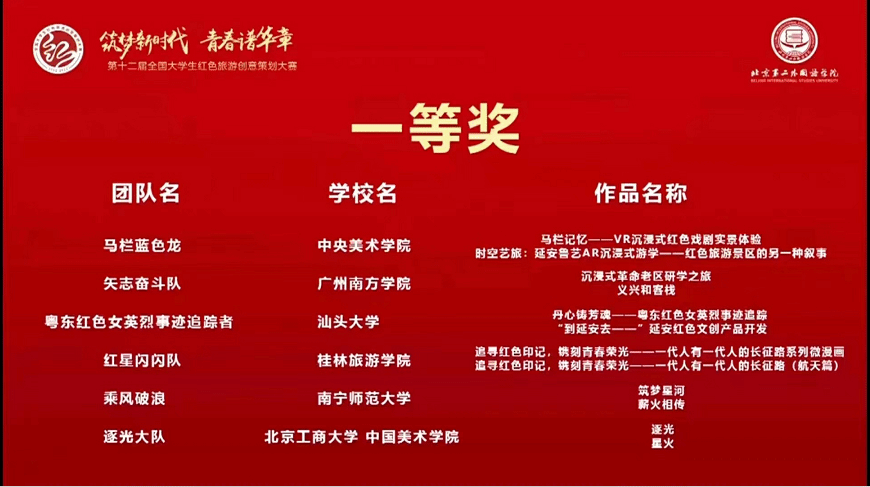 2022年8月18日,第十二届全国大学生红色旅游创意策划大赛全国总决赛落下帷幕,我校“矢志奋斗团队”荣获全国总决赛一等奖!此次比赛参赛学校众多,我校是广东省获奖高校中唯一一所应用型高校。