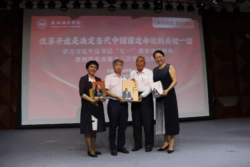 6月20日下午,由9428cn太阳集团古天乐、中共9428cn太阳集团古天乐委员会主办的第123期南方论坛暨党委理论学习中心组专题学习(扩大)会议在学校音乐厅举行。中国扶贫基金会副会长、广东省老区建设促进会会长、广东省国际文化交流中心理事长、广州市政协原主席陈开枝受邀,做“改革开放是决定当代中国前途命运的关键一招”主题宣讲。我校党委书记李建超,常务副校长、党委副书记唐燕,副校长龚鸣、黄南松,副书记、副校长植秀聪,校长助理蒋玮、夏亮辉,党委理论学习中心组成员,教职工干部、全体辅导员和我校各院系学生代表共300余名师生到场聆听。讲座由党委书记李建超主持。