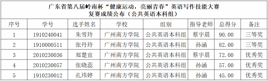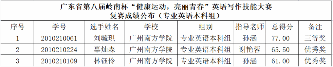 近日,广东省第八届岭南杯“健康运动,亮丽青春”英语写作技能大赛复赛和决赛在广东外语外贸大学举行。在我校孙涵、蔡雨晨、谢艳蓉等老师的指导下,外国语学院朱雪玲等8位学生代表学校参加复赛,并以扎实的英语写作基础和出色的表现在比赛中斩获佳绩。