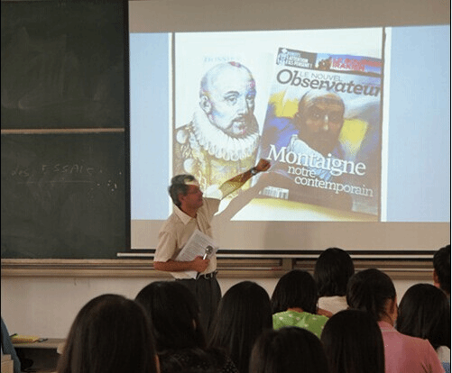 Pierre教授围绕蒙田到底是不是法国文化现代化新形象展开了演讲。为了避免大家对这个讲题的争议,他首先讲解了为什么蒙田是新形象。接着,Pierre教授引用名人之语来说明蒙田被称作新形象的原因所在:蒙田不仅符合现代人的新形象,他的文学作品更是对现代人有深刻的影响。Pierre教授告诉大家,在他遇到困难时,蒙田的《随笔集》给了他很大的帮助。讲座中,Pierre教授提出“读蒙田的作品能带给我们什么有用的东西”这一问题,并阐述了他自己的看法。最后,他以蒙田《随笔集》的序作为本次讲座的结尾。