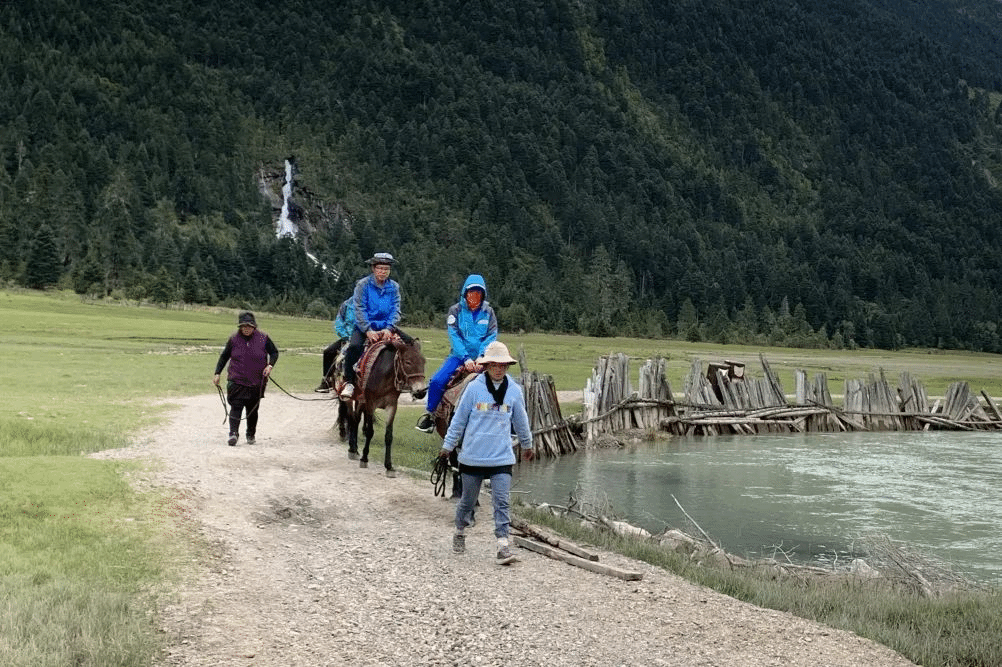 潘浩天与援藏朋友们下乡考察生态环境在藏区向导带领下体验骑马 图源 /受访者