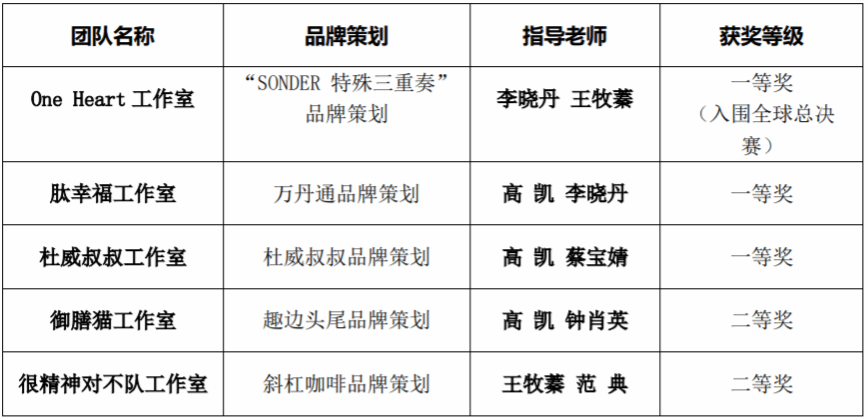 其中,“One heart”团队创作的“SONDER 特殊三重奏”品牌推广策划进入全国前33强,成功入围全球品牌策划总决赛。这是我校首次斩获这项国际品牌策划赛事的特等入围奖,实现了我校在该全球赛事上的重大突破。