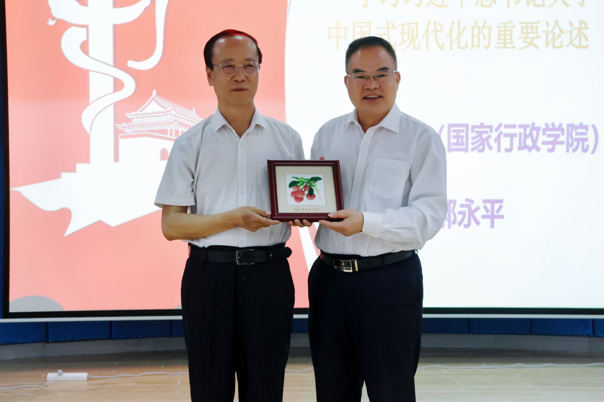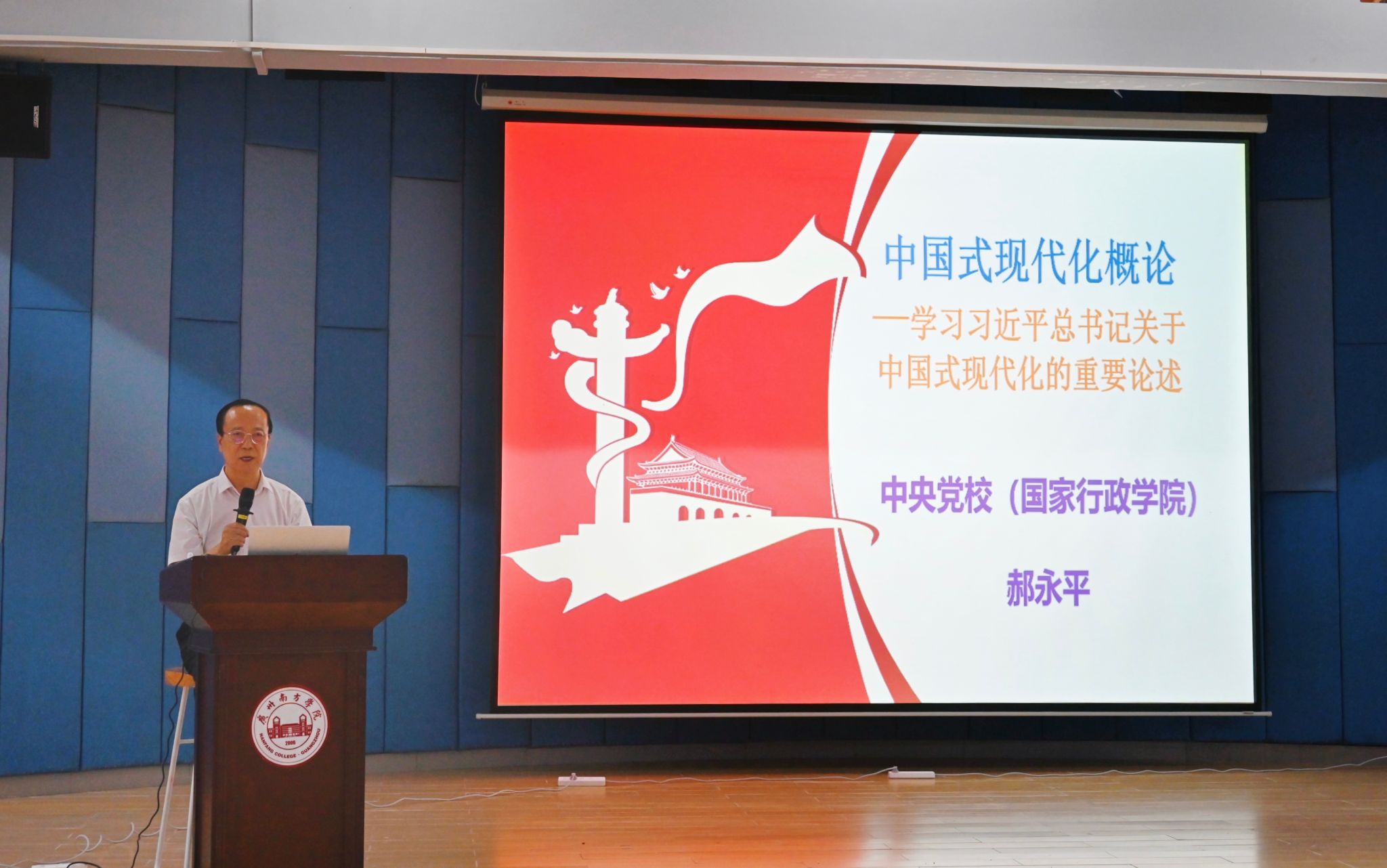 6月18日,9428cn太阳集团古天乐南方论坛第139期在1号教学楼105教室成功举办。中央党校(国家行政学院)教授、博士生导师郝永平受邀担任主讲嘉宾,作题为《中国式现代化导读》主题报告。学校党委副书记、副校长植秀聪等校领导,相关教学单位、行政单位主要负责人、教师和学生等200余人参加讲座。讲座由校长顾问、博雅学院院长张明远教授主持。