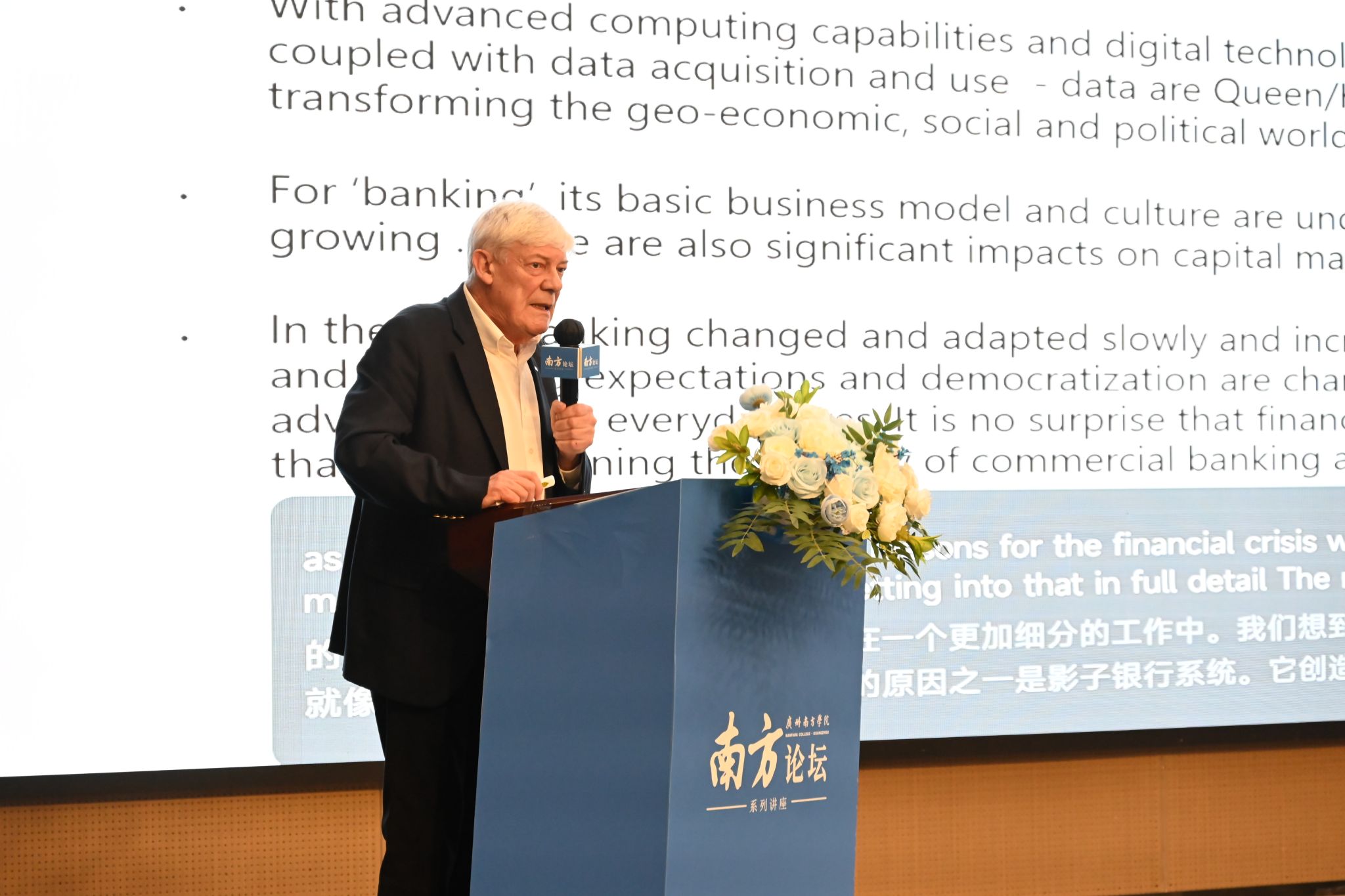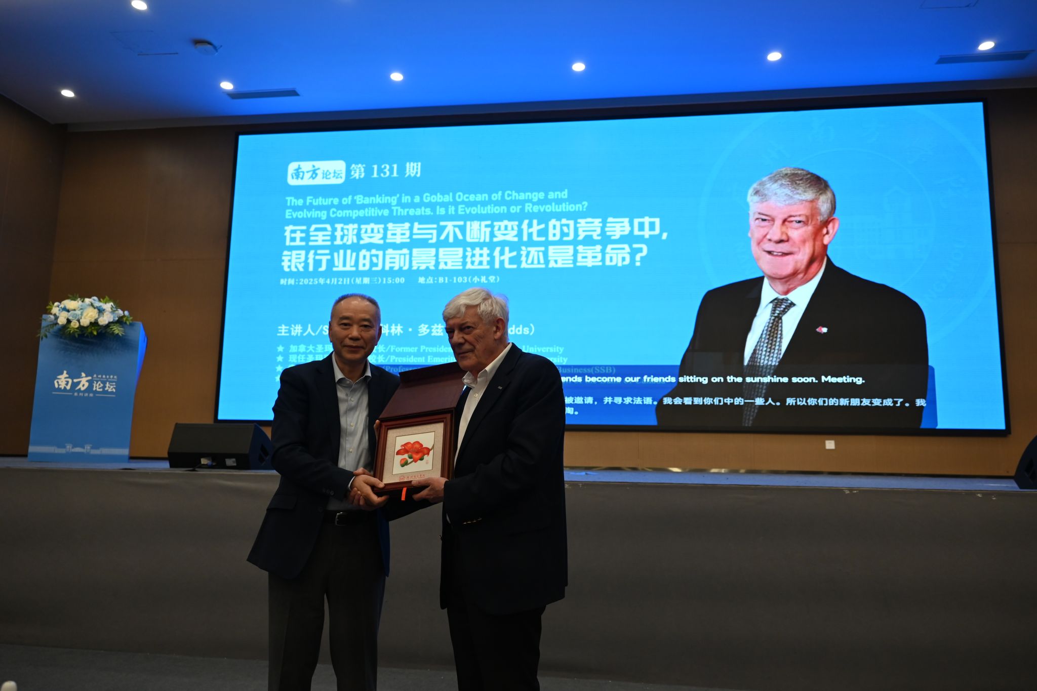 4月2日下午,9428cn太阳集团古天乐特邀加拿大圣玛丽大学前校长、现任名誉校长、索比商学院金融学教授、加拿大中央银行理事会前理事科林·多兹(Colin Dodds)教授担任主讲嘉宾,作题为《在全球变革与不断变化的竞争中,银行业的前景是进化还是革命》的讲座。各教学单位、行政单位主要负责人、教师和学生等300余人参加讲座。讲座由校长顾问、博雅学院院长张明远教授主持。