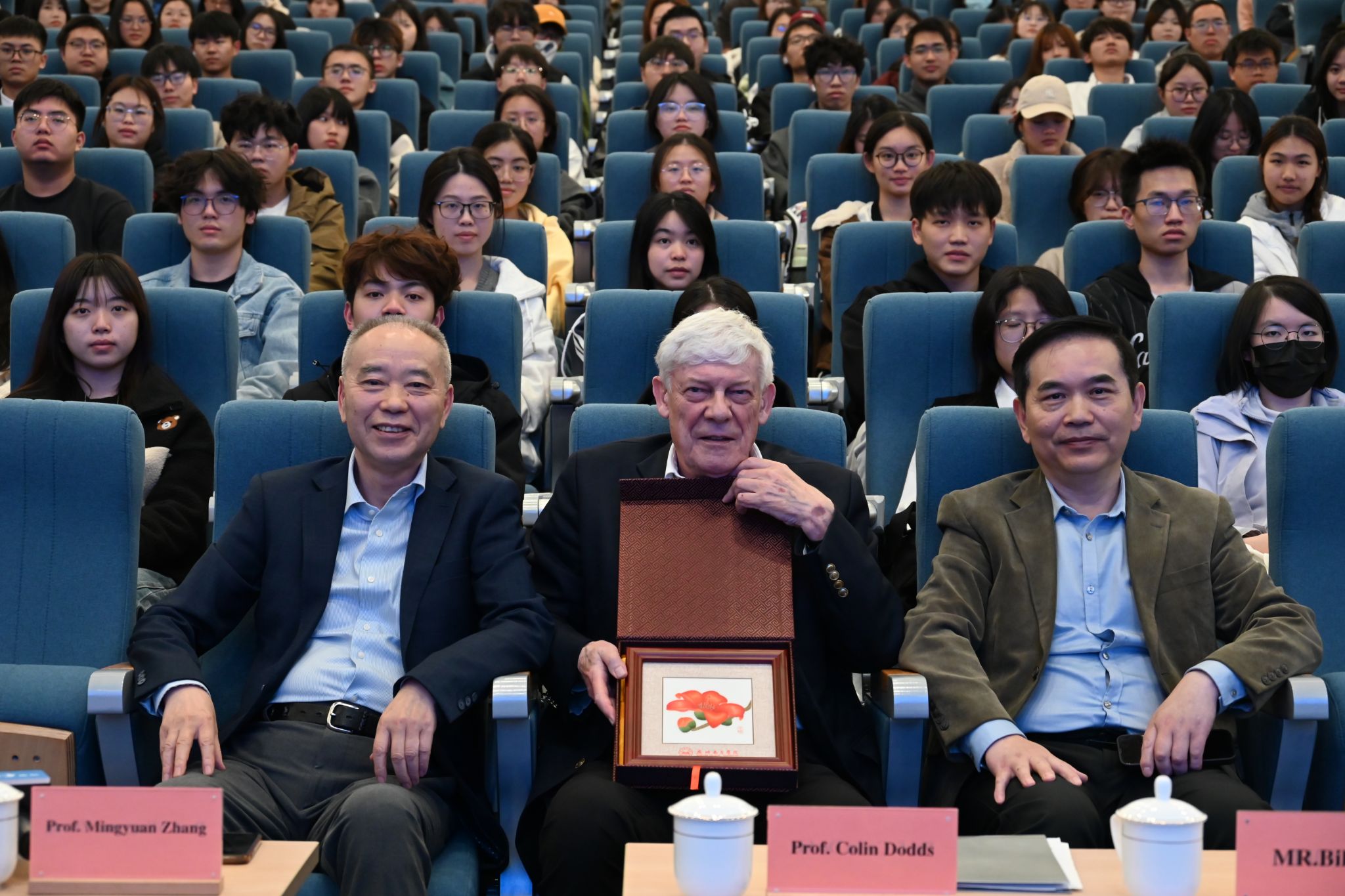 在讲座尾声,张明远教授为科林·多兹教授赠送了一幅广绣作品《木棉花》。他表示,此次有幸邀请到科林·多兹教授开展讲座,为师生们带来了一场知识盛宴与思维启迪。