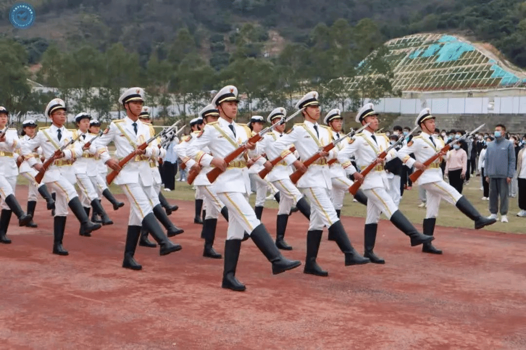 学校大学生国防教育队踏着整齐的步伐护送五星红旗入场,鲜艳的五星红旗伴随着国歌声冉冉升起,全体师生向国旗行注目礼,向祖国表达深切的祝福。