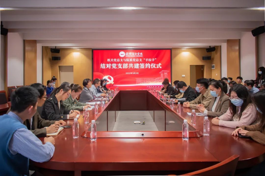 为使党史学习教育成效可持续发展,推进深入领会十九届六中全会精神,提升学校基层党组织建设品质,确保党建引领作用的落地,3月3日下午,学校机关党总支与院系党总支在学校综合楼第一会议室举行“手拉手”结对党支部共建签约仪式。党委书记李建超,常务副校长、党委副书记、机关党总支书记唐燕,各结对共建党支部书记及师生党员代表参加共建仪式。仪式由机关党总支副书记宋得福主持。