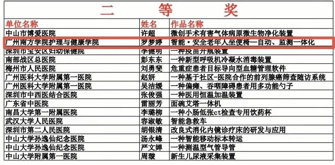 12月18-19日,广东省护理学会主办、南部战区总医院协办《第十届广东省护理用具创新大赛暨管理研讨班》通过线上顺利举行。经过初赛、复赛和决赛角逐,我校护理与健康学院由罗梦婷、卢海娴、周丽仪(指导老师)组成的参赛队伍在获奖人数十分有限的情况下,凭借《智能·安全老年人坐便椅——自动、监测一体化》,在901项作品中脱颖而出,获得二等奖的佳绩。吴梓明、陈静、彭倩菲、张汉荣(指导老师)团队的参赛作品《纸尿裤-大小便监测预警系统一体化设计》和郭劭楷、杨慧雯、王卓琳、李紫红、詹雪莹、曾瑜欣、余冰、阙粤桦、韩婷(指导老师)团队的参赛作品《新型便携式智能输液警报系统》获得优胜奖。