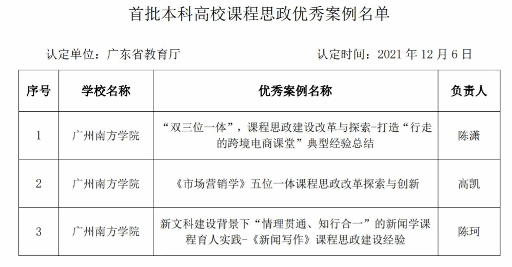 2021年12月6日,广东省教育厅公布了首批本科高校课程思政优秀案例获评名单,我校共有3个案例获评为课程思政优秀案例,分别为陈潇老师的《“双三位一体”课程思政建设改革与探索—打造“行走的跨境电商课堂”典型经验总结》、高凯老师的《< 市场营销学>五位一体课程思政改革探索与创新》和陈珂老师的《新文科建设背景下“情理贯通、知行合一”的新闻学课程育人实践—< 新闻写作>课程思政建设经验》。