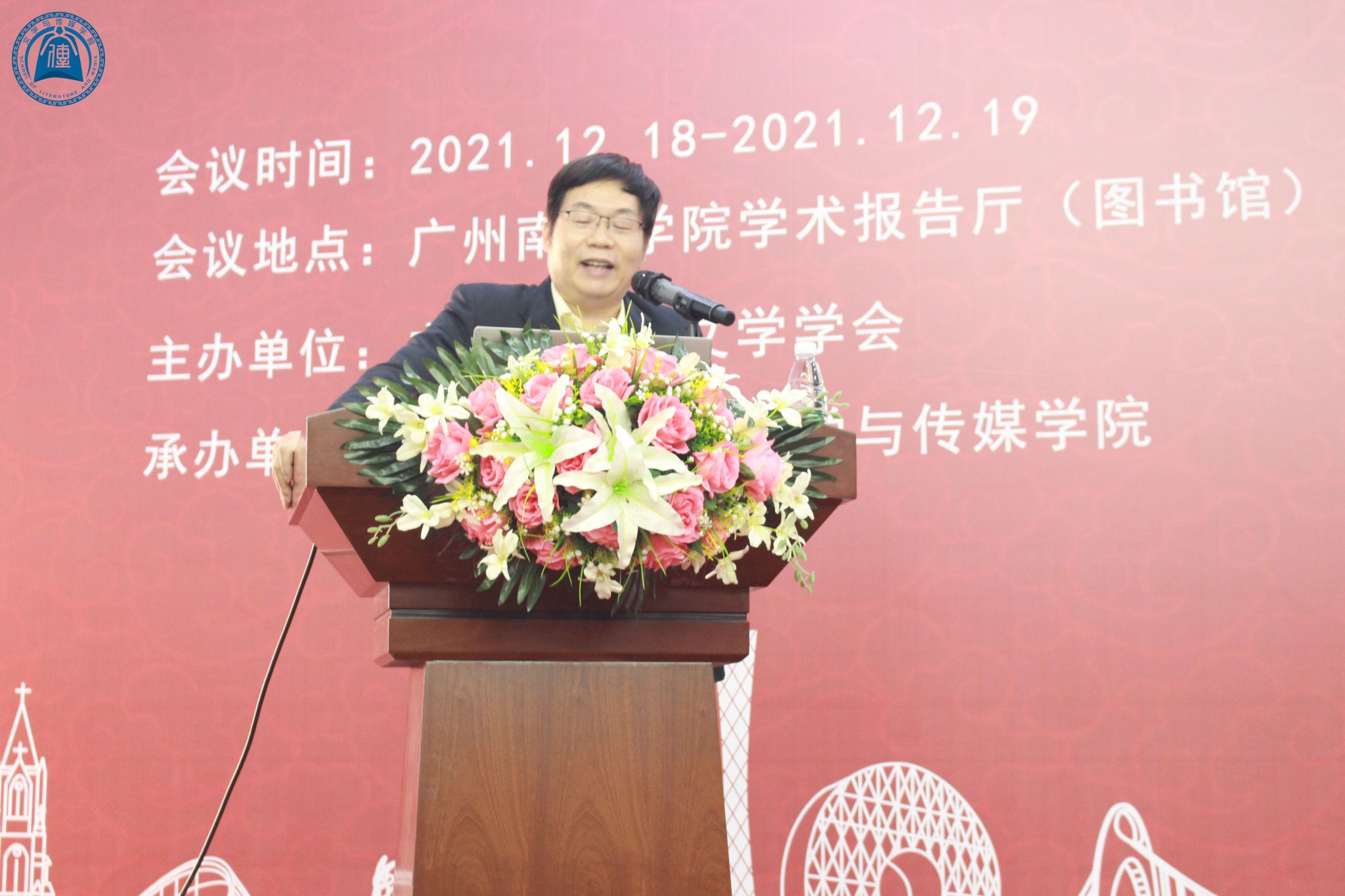 彭玉平会长作为广东省中国文学学会会长上台致辞。他首先对广东省中国文学学会的四位前会长做出的努力与贡献表示了感谢。随后,彭会长对学会未来的发展发表了自己的看法。他认为,在不同学科的交叉视野中,人们对文学的研究可以上升到一个全新的境界。因此,可以在跨学科的基础上,对文学进行深入的研究。他指出,本次广东省中国文学学会2021年会及中国文学研究与教学研讨会共同开展具有重要意义:“教学与研究彼此相关,互相促进。对于高校而言,一种理想的文学生态正是创作、教学与研究三位一体的,我们期待能在这次会议上能多层次多角度多碰撞,从而能多感悟多认识多收获。”