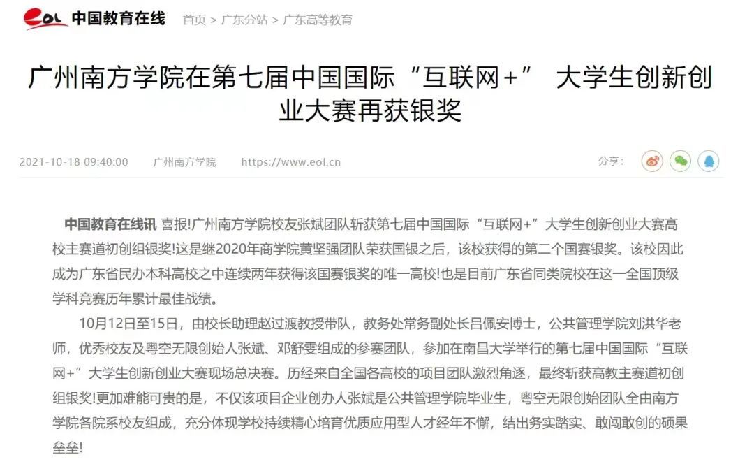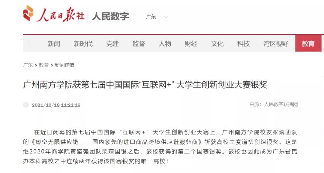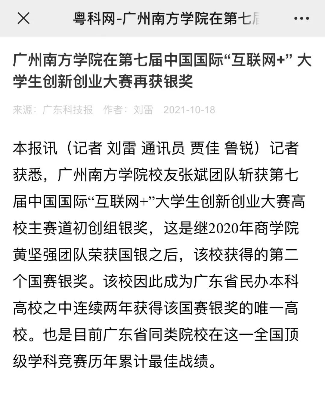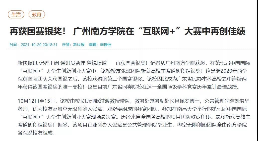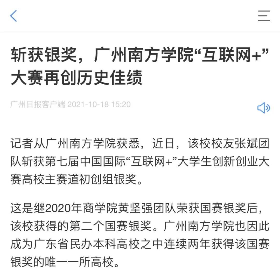 近日,我校校友张斌团队斩获第七届中国国际“互联网+”大学生创新创业大赛高校主赛道初创组银奖!作为广东省民办本科高校之中连续两年获得该国赛银奖的唯一高校,消息一经发出便迅速引起了广泛关注。学习强国号、人民日报社、中国教育在线、广州日报客户端、广东科技报、新快报等多家主流媒体纷纷报道。以下是相关报道内容:
