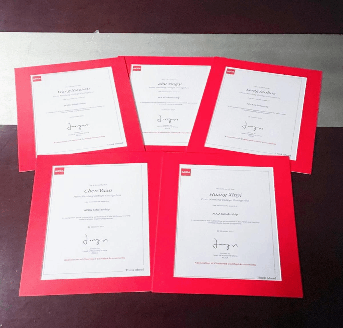 近日,我校会计学院ACCA班陈宇岸、朱颖琪、梁浚铧、王潇健、黄心奕五名学生获得2021年度ACCA年度优秀学员奖