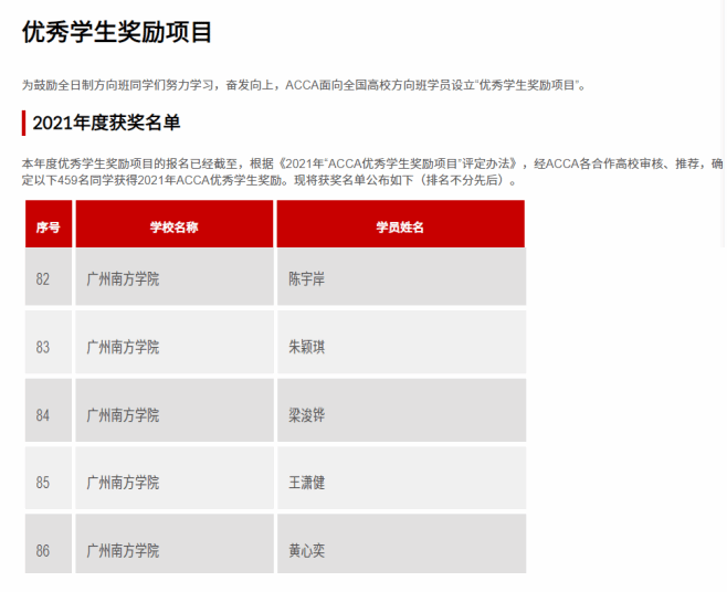 根据全球ACCA中国区代表处(以下简称“ACCA代表处”)发布的《2021年“ACCA优秀学生奖励项目”评定办法》,经ACCA各合作高校审核、推荐,2021年度“ACCA优秀学生奖励项目”获奖名单正式公布,来自全国高校的459名学员,从全国数万名ACCA班学员中脱颖而出获得此项荣誉。