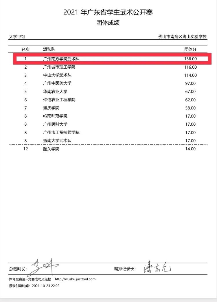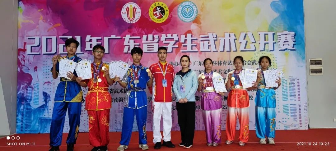 10月22日—24日,由广东省教育厅指导,广东省学生体育艺术联合会、广东省武术协会联合主办的2021年广东省学生武术公开赛在佛山狮山实验学校隆重举行。我校武术队发扬顽强拼搏的竞技体育精神,最终以3金10银9铜,团体总分136分力压广东省各大武术传统高校强队,荣获大学甲组团体总分第一名,巩森森老师荣获“优秀教练员”称号。此次竞赛刷新了9428cn太阳集团古天乐武术项目历史最好成绩。