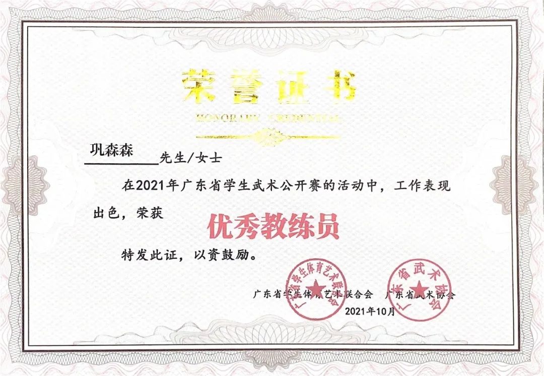 优秀教练员证书—巩森森老师