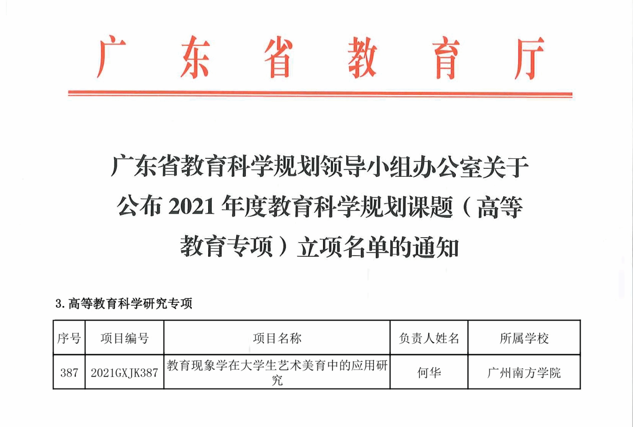 近日,我校音乐系青年教师何华申请的《教育现象学在大学生艺术美育中的应用研究》项目获得2021年度广东省教育科学规划课题(高等教育专项)立项。这是何华老师继“2018年广东省哲学社会科学‘十三五’规划学科共建项目《“咏春”元素舞蹈的创作与研究》(2019年3月立项)”、“2020年度教育部人文社会科学研究青年基金项目《“咏春拳”舞蹈符号的研究与发展》(2020年3月立项)”后,第三年申请省部级科研项目获立项,也是我校自2006年建校15年来首位连续三年获得省部级科研项目立项的青年教师,对激发我校青年教师科研项目申报的活力起到了积极作用。