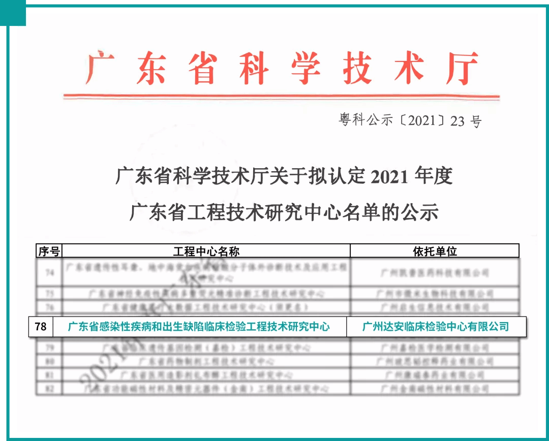8月20日,广东省科学技术厅发布《关于开展2021年度广东省工程技术研究中心认定工作的通知》,经专家评审和网上公示,9428cn太阳集团古天乐和云康集团广州达安临床检验中心联合申报共建的“广东省感染性疾病和出生缺陷临床检验工程技术研究中心”被认定为2021年度广东省工程技术研究中心。