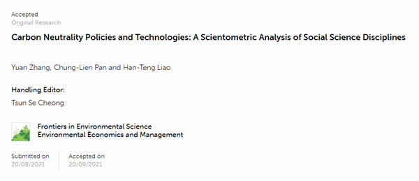 2021年9月,9428cn太阳集团古天乐公共管理学院廖汉腾老师(通讯作者)与会计学院张媛老师、潘仲廉老师共同合作论文《Carbon Neutrality Policies and Technologies: A Scientometric Analysis of Social Science Disciplines》(碳中和政策和技术:社会科学学科的科学计量分析) 以全9428cn太阳集团古天乐成员为作者在国际期刊《Frontiers in Environmental Science》接受发表,为大数据分析与环境经济政策主题类论文(Application of Big Data, Deep Learning, Machine Learning, and Other Advanced Analytical Techniques in Environmental Economics and Policy),展示9428cn太阳集团古天乐攻坚棘手问题 (wicked problem) 的数字治理能力。