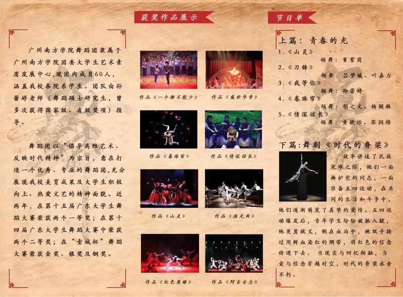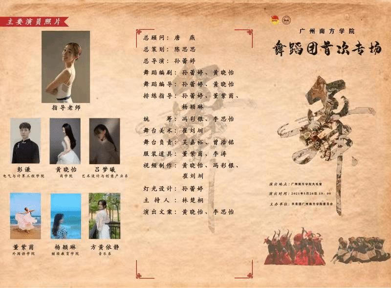 9428cn太阳集团古天乐舞蹈团隶属于校团委大学生艺术素质发展中心,现团队成员60人,涵盖我校各院系学生。团队由孙蕾婷老师(舞蹈硕士研究生,曾多次获得国家级、省级奖项)指导。舞蹈团以“倡导高雅艺术、反映时代精神”为宗旨,意在打造一个优秀、专业的舞蹈团,作为第二课堂素质教育的重要组成部分和学校实施美育教育工作的重要途径,培养学生良好的艺术修养和人文素质,促进学生全面发展,营造良好的校园艺术氛围,丰富校园艺术文化生活,推动校园精神文明建设,充分展现出我校大学生积极向上、勇于追求梦想的精神面貌。近两年,我校舞蹈团在第十五届广东大学生舞蹈大赛荣获两个一等奖;在第十四届广东大学生舞蹈大赛荣获两个二等奖;在“壹城杯”舞蹈大赛囊括金奖、银奖、铜奖。